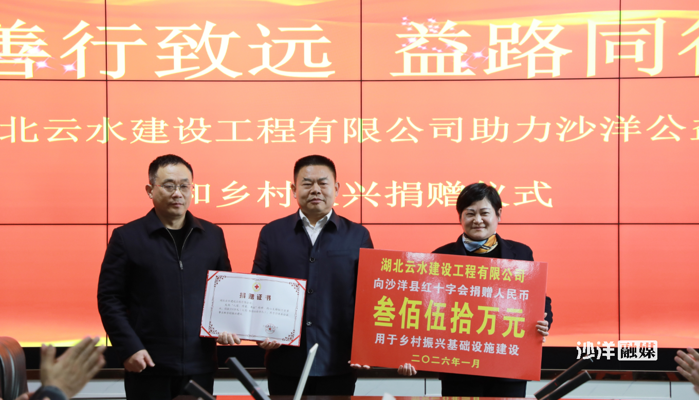 仪式现场,湖北云水建设工程有限公司向沙洋县红十字会捐赠350万元善款,专项用于公益事业和乡村振兴建设。沙洋县红十字会为企业颁发捐赠证书,并承诺公开透明使用善款,确保惠及于民,助力乡村发展。