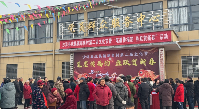 2月4日,沈集镇郑岗村在村文化广场举办第二届文化节暨迎新春活动。活动以“笔墨传福韵·鱼跃贺新春”为主题,将党建元素融入写春联、送福鱼等民俗活动,让村民在家门口感受年味与党组织温暖。