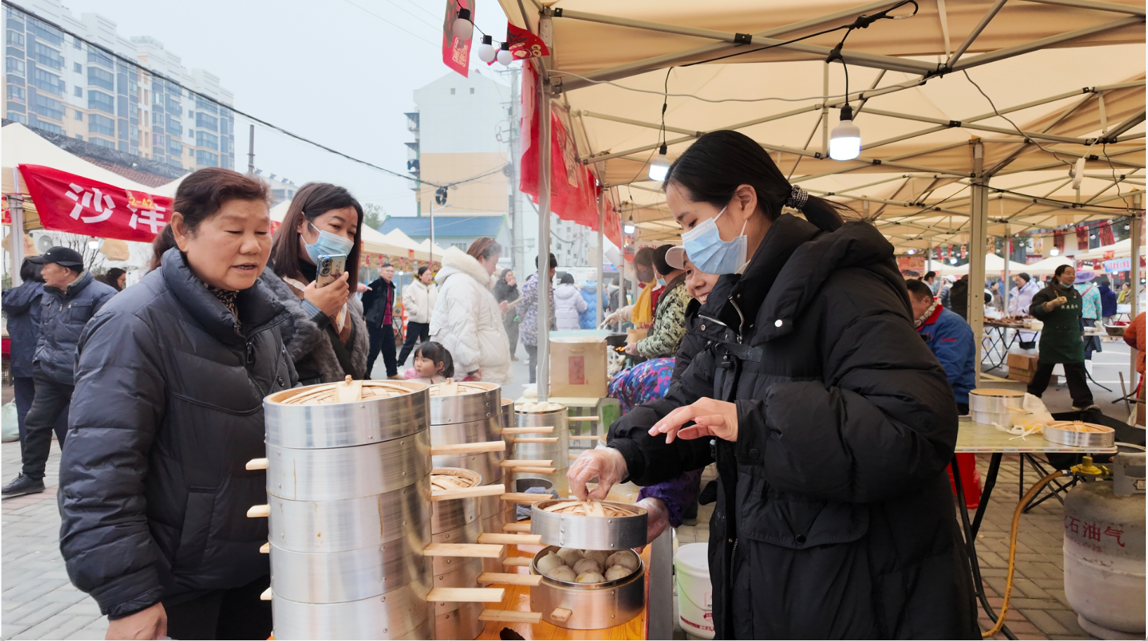 循着香味走进美食品鉴区,牛肉包、羊肉串的香气在空气中弥漫,刚出锅的豆饼热气腾腾,摊主们手脚麻利地制作美食,食客们或站或坐大快朵颐,舌尖上的沙洋味道勾住了所有人的味蕾。“鲜肉小笼包、牛肉小笼包、酱肉小笼包是我们摊位最畅销的产品,从早上到现在已经卖出去三百余份。”小吃摊主金老板的摊位前始终排着长队,她笑着说:“来的都是回头客,大家吃得开心,就是对咱手艺的最大认可。”
