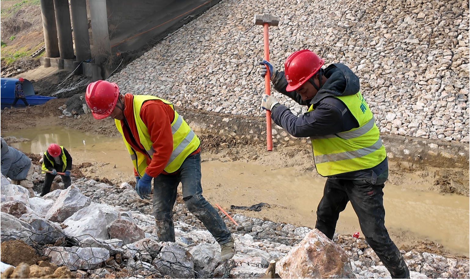 在拾回桥镇拾桥河治理项目施工现场,多台工程机械轰鸣作业,施工人员抢抓晴好天气,全力推进固脚护坡作业。从基础开挖、块石装填到坡面修整,各道工序衔接紧密、配合高效,机械的轰鸣声与工人们忙碌的身影,共同构成了一幅热火朝天的水利建设画卷。