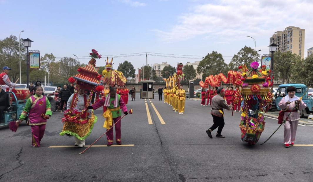 上午9时,锣鼓喧天中,民俗巡游队伍火热启程,舞龙舞狮、彩船旱船、十番锣鼓等传统民俗节目轮番上演,现场热闹非凡,节日氛围十分浓厚。活动兵分两路同步开展,一组在洪岭社区文体广场集结,另一组从城区卫生服务中心出发。民俗演员身着盛装,踏着欢快节奏走街串巷,先后走进县政府、县卫健局、财政局、农业农村局、教育局、住建局等县直单位及重点企业。