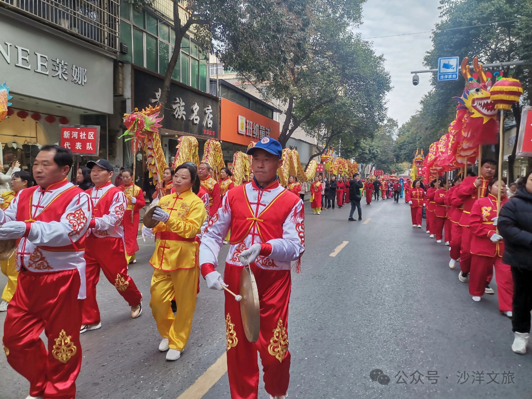 踩街队伍由区人民政府出发,途经龙井大道、市体育文化中心,身着彩服的传统民俗艺人和非遗传承人组成的舞龙舞狮、腰鼓秧歌等表演队伍开展踩街和定点表演