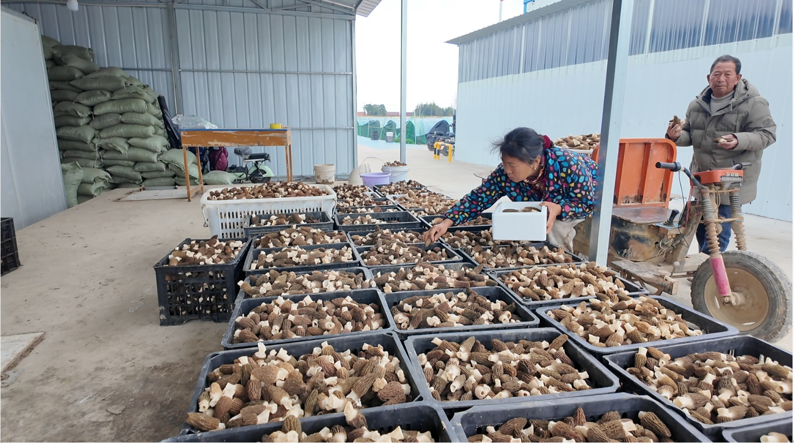 走进黎坪村的羊肚菌加工车间,恒温冷库内,刚采收的鲜菌和已经经过烘干的干品被分区存放,恒定的低温牢牢锁住菌菇的新鲜口感与营养;隔壁的烘干作业区更是一派紧张有序的忙碌景象,工人们将鲜菌均匀铺在托盘上,随着烘干架推入、烘干设备启动,控温、除湿、烘干、冷却全流程运行,浓郁醇厚的菌香瞬间弥漫了整个车间。
