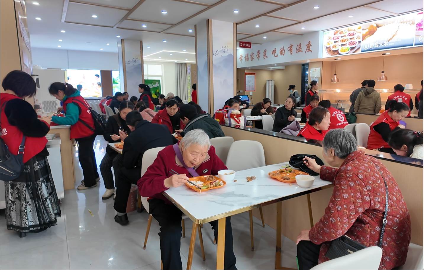 开业当日,幸福里食堂内窗明几净、氛围温馨,荤素搭配的营养饭菜香气四溢,不少居民早早来到食堂,有序排队就餐。餐桌上,大家一边品尝着热气腾腾、可口实惠的饭菜,一边聊着家常,脸上洋溢着幸福的笑容,整个食堂充满了浓浓的烟火气与温情。