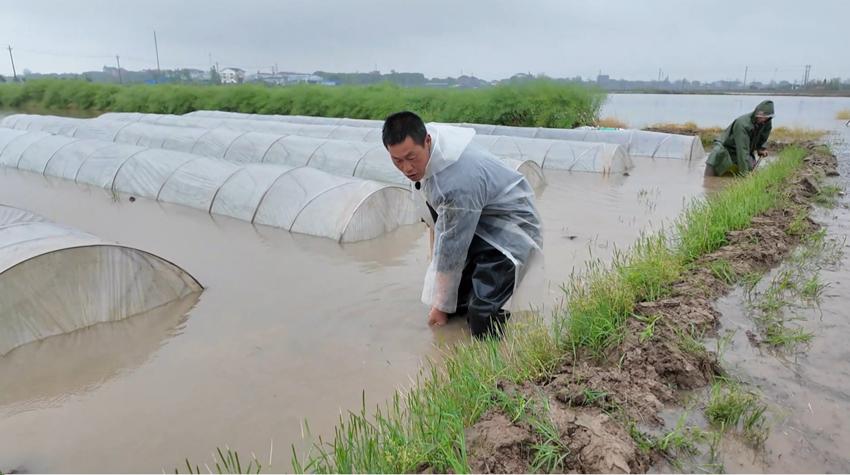 “昨天晚上下了一夜大雨,秧田全都被淹了,我们早上6点就赶来打防水堤,现在用潜水泵抓紧排水,尽量把秧苗保住。”毛李镇江新村一组村民李顺兵一边加固堤埂,一边说道。